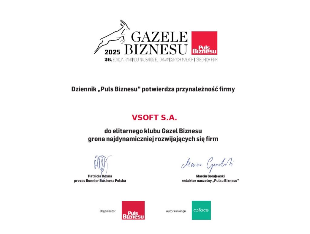 W 26. edycji rankingu Gazele Biznesu wyróżniono 4785 firm, co potwierdza dobrą kondycję polskiego sektora MŚP. Fakt, że VSoft znalazł się w tym gronie już po raz 11., jest dla nas potwierdzeniem, że konsekwentny rozwój, stabilność finansowa i długofalowe myślenie biznesowe przynoszą realne efekty.